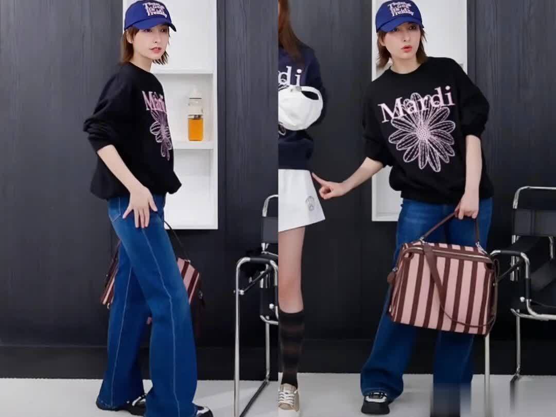 右边则将卫衣衣摆的一侧塞进裤子里,既增加了时髦感,又突出了腰线。配上棒球帽,造型层次感就丰富起来。